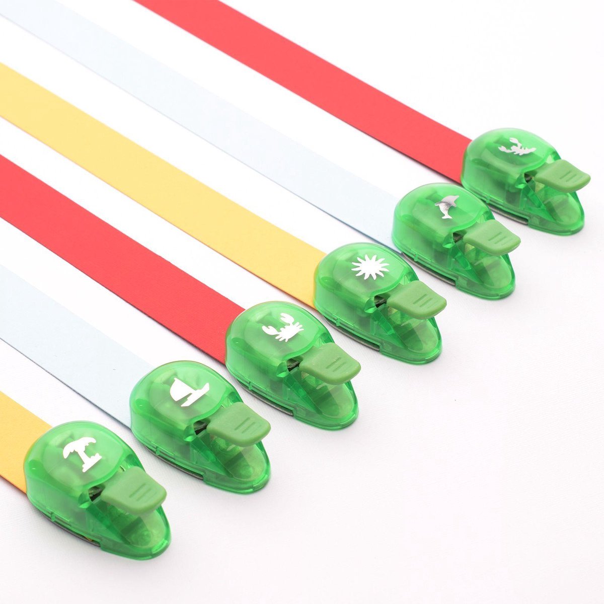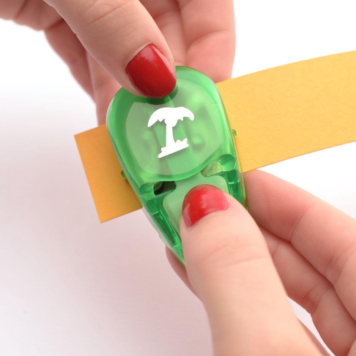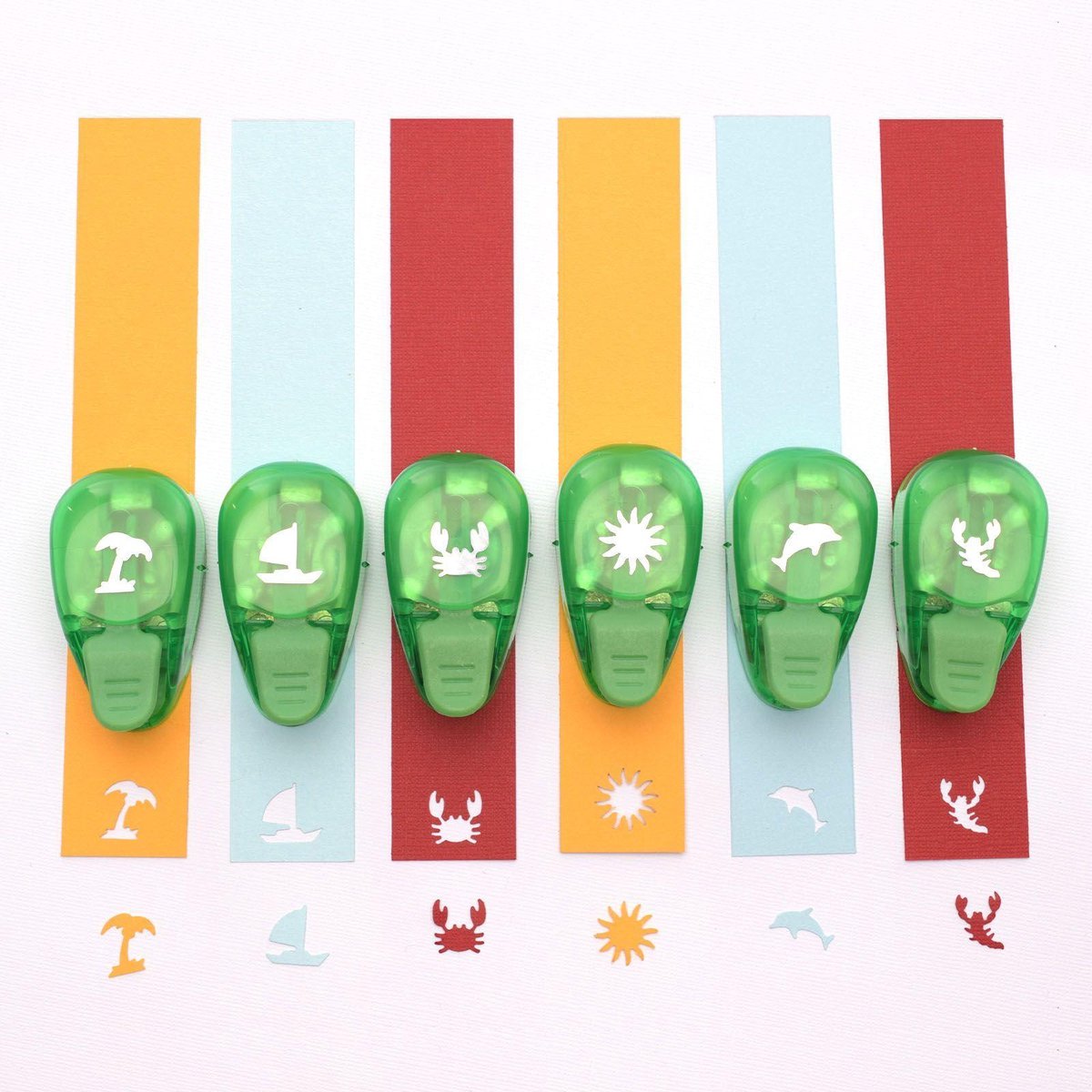 Ponsen set bestaande uit 6 figuurponsen, thema zomer. Met deze figuurponsen stans je in één handbeweging een zeilboot, zon, dolfijn, palmboom, krab of kreeft (1 tot 1,5 cm) uit papier, cardstock, foto’s, kurk, dun foam en meer.