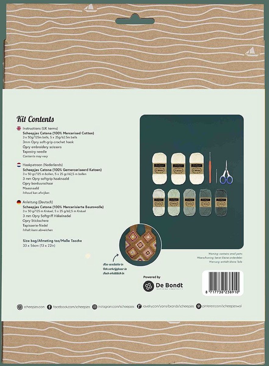 The bag is made up of several crocheted squares, also known as granny squares. The clear pattern is easy to follow, allowing you to quickly master crocheting a granny square. The use of different colors keeps the pattern varied and interesting. The squares are then joined together to create a bag. The entire bag is crocheted with Scheepjes Catona, a 100% mercerized cotton yarn with a beautiful sheen in a fingering weight.