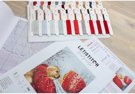 Kit de broderie au point de croix pour une jolie scène de Noël représentant une fillette avec son chien dans la neige.