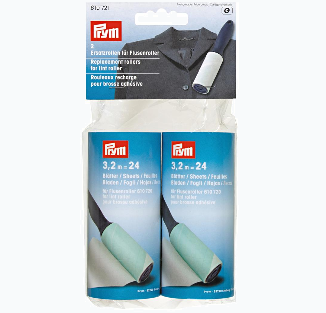 2 vervangrollen voor de pluizenverwijderaar van Prym. Rollen met kleefband. Om pluisjes van kleding te verwijderen.